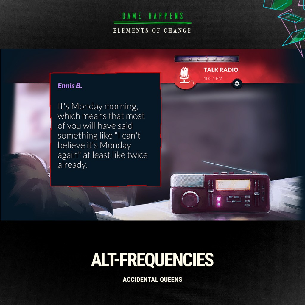 Alt-Frequencies is an audio-based game, revolving around radio stations that reset every 3 minutes. Populated with all sorts of different characters and personalities, players get an intimate look into the lives of radio hosts, conspiracy theorists, students, politicians, underground activists, train station managers – and a dog. By redistributing information, you change what happens in the next 3 minute time loop and impact both news cycles and the lives of the people behind them. Listen as their personal stories evolve, in a world that seems to stand still.